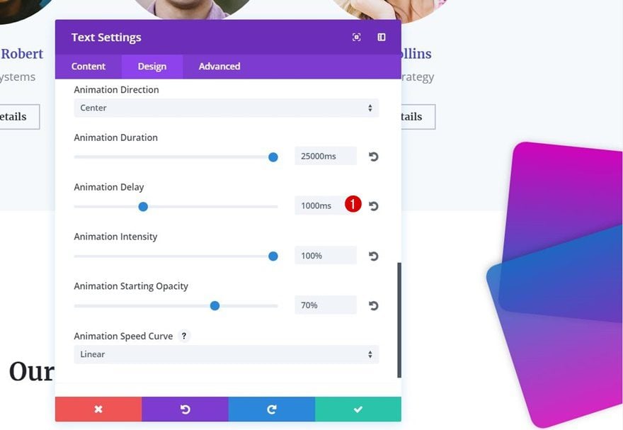 The last change we’ll need to make is adding an animation delay to this shape by going to the Animation subcategory and adding ‘1000ms’ to the Animation Delay option.