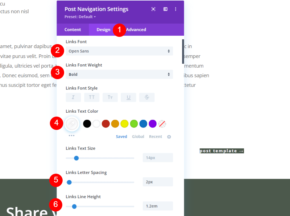 Open the Post Navigation module and select the Design tab. We’ll do the Content setting last this time. Set the Font to Open Sans, the Weight to Bold, the Style to All Caps, and the Color to White. Change the Letter Spacing to 2px and the Line Height to 1.2em.